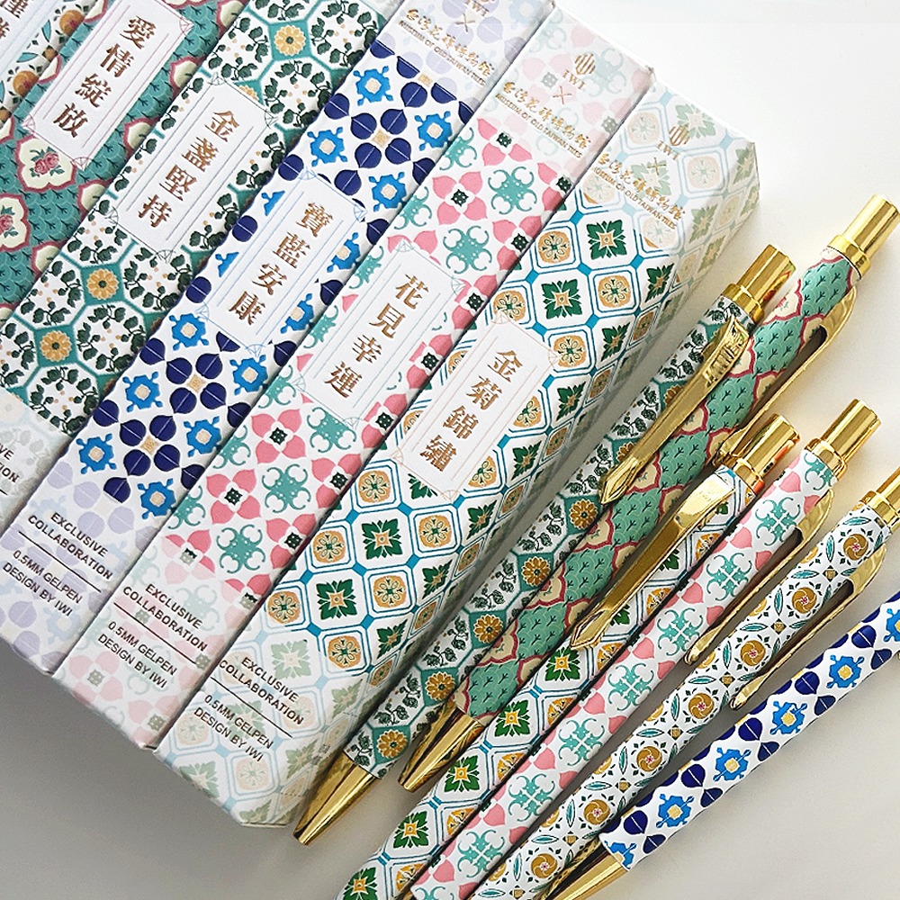 IWI與臺灣花磚博物館聯名-RETRO時光系列中性筆, 精選出花磚設計圖案印於鋁合金筆身並搭配復古造型設計筆夾,便利的按壓式結構及滑順0.5mm筆芯,讓您在書寫喚醒記憶中的美好時光。