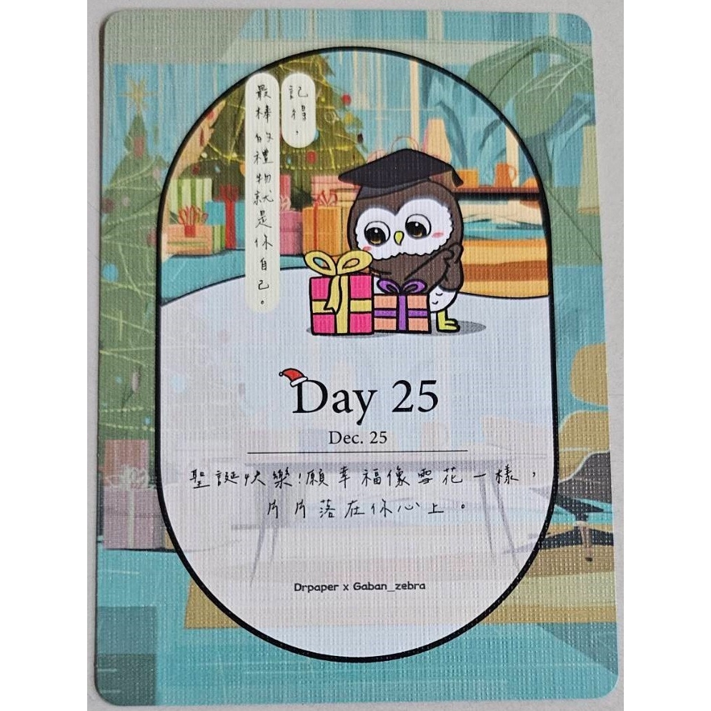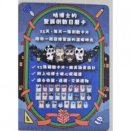 倒數卡:25 張(1–25 日,每天一張,設計有聖誕氛圍插圖) |