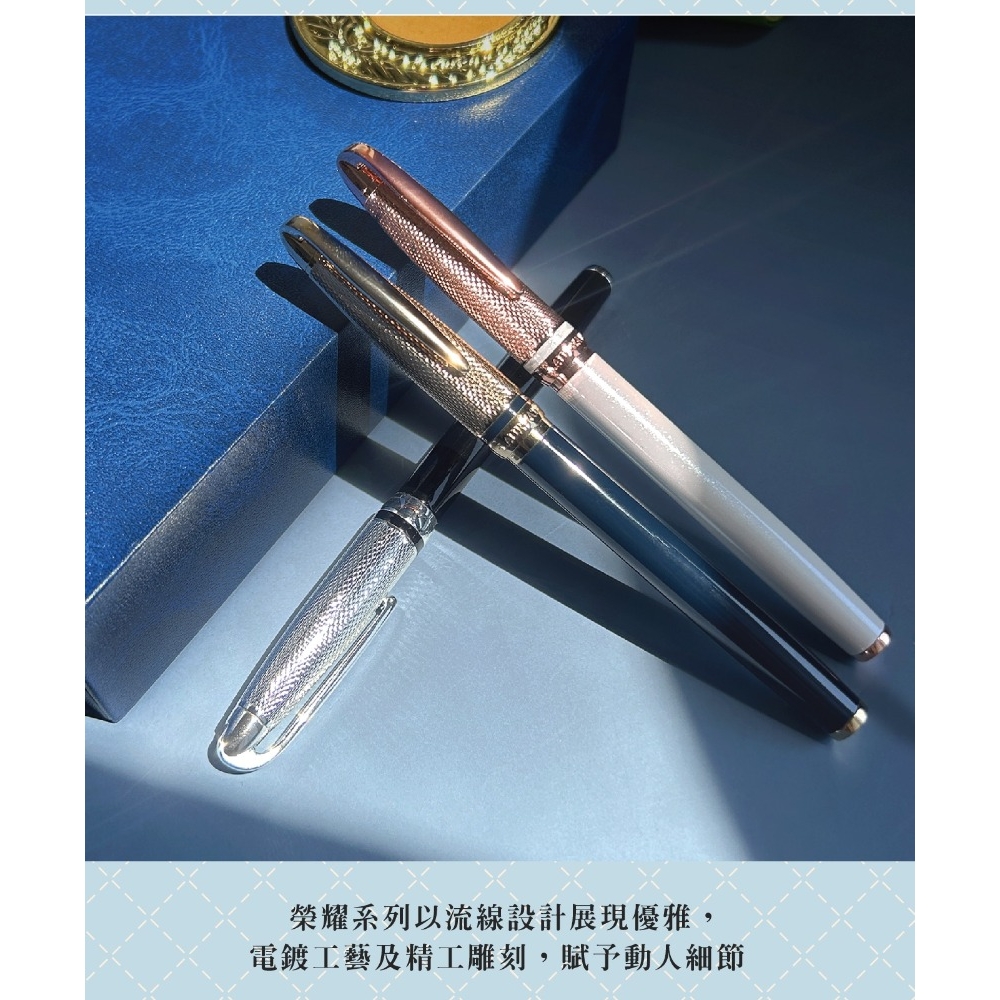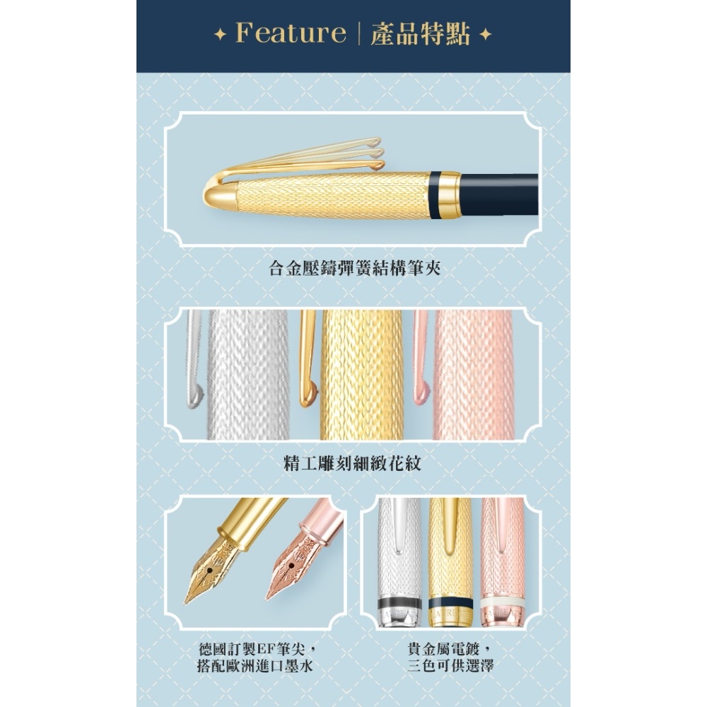 商品說明:以流線型設計展現優雅,搭仔彈簧式筆夾,並配以貴金屬電鍍工藝及精工雕刻的典雅花紋,宛如汗水與淚水交織成流,波光粼粼地閃耀著,給努力的自己注入驕傲與肯定,賦予不凡的榮耀。